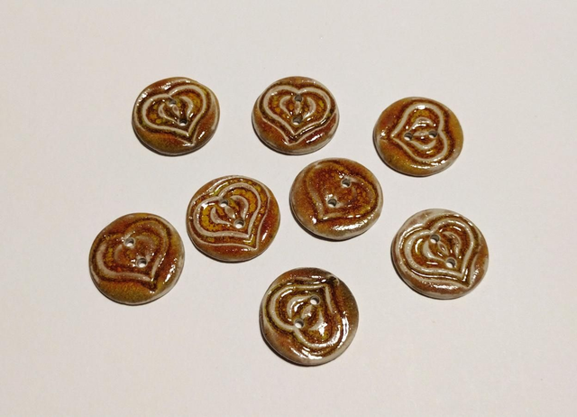 Bouton en grès émaillé texturé figurant un coeur de couleur beige/marron orangé.