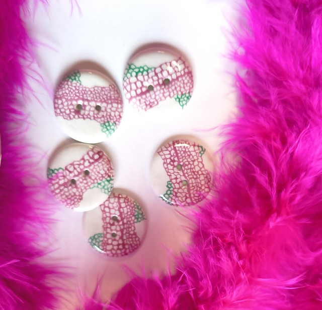 Bouton en porcelaine décoré d'un motif filet rose et vert.