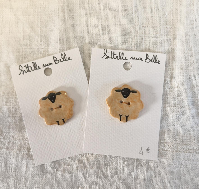 Bouton en porcelaine, mouton brun à tête et pattes noires. Pour le petit modèle, le marron est plus clair.