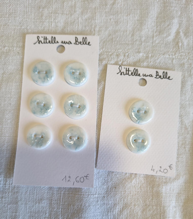 Boutons en porcelaine délicatement filigranés blanc et bleu clair.