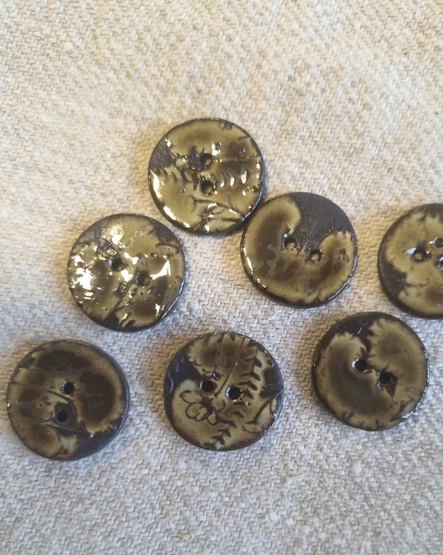 Boutons en grès, imprimés délicatement d'un motif floral, avec des nuances de bruns plus ou moins clairs.
