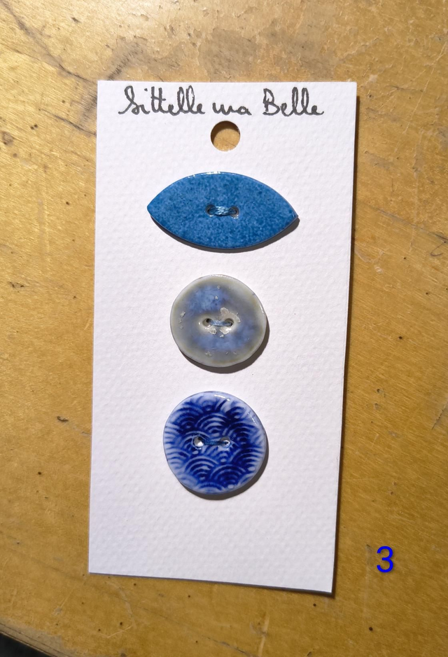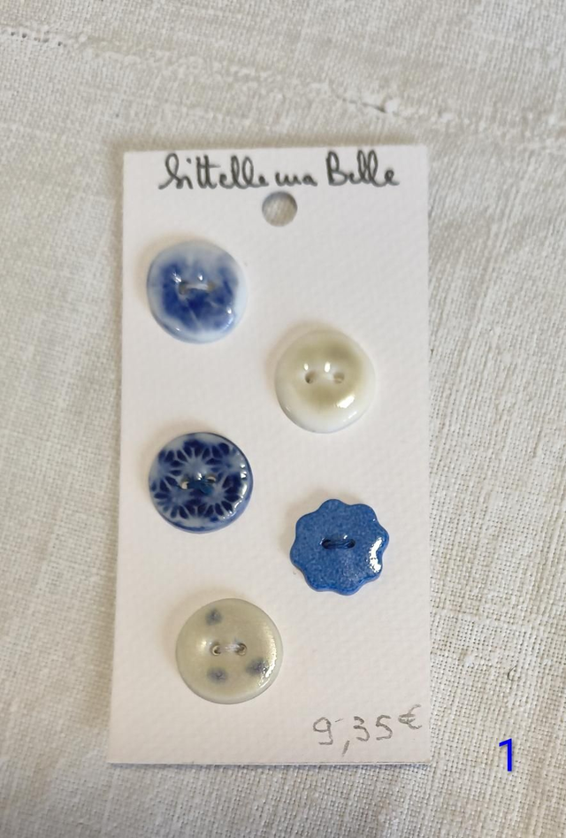 Voici 3 combos de boutons bleus et écrus, en porcelaine et grès, parfaitement assortis.
