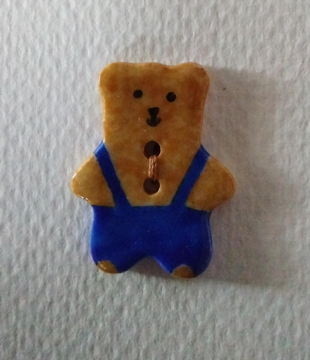 Bouton ourson salopette bleue en porcelaine émaillée.