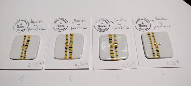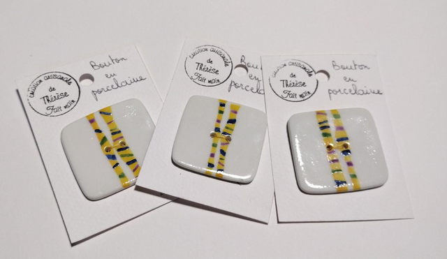 Bouton carré en porcelaine décoré de deux bandes majoritairement jaunes et ajouts de couleurs (vert, bleu et mauve).