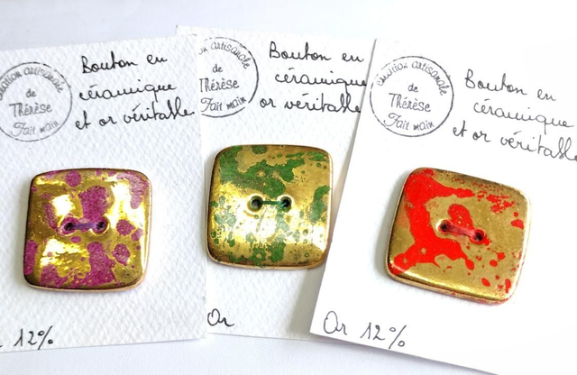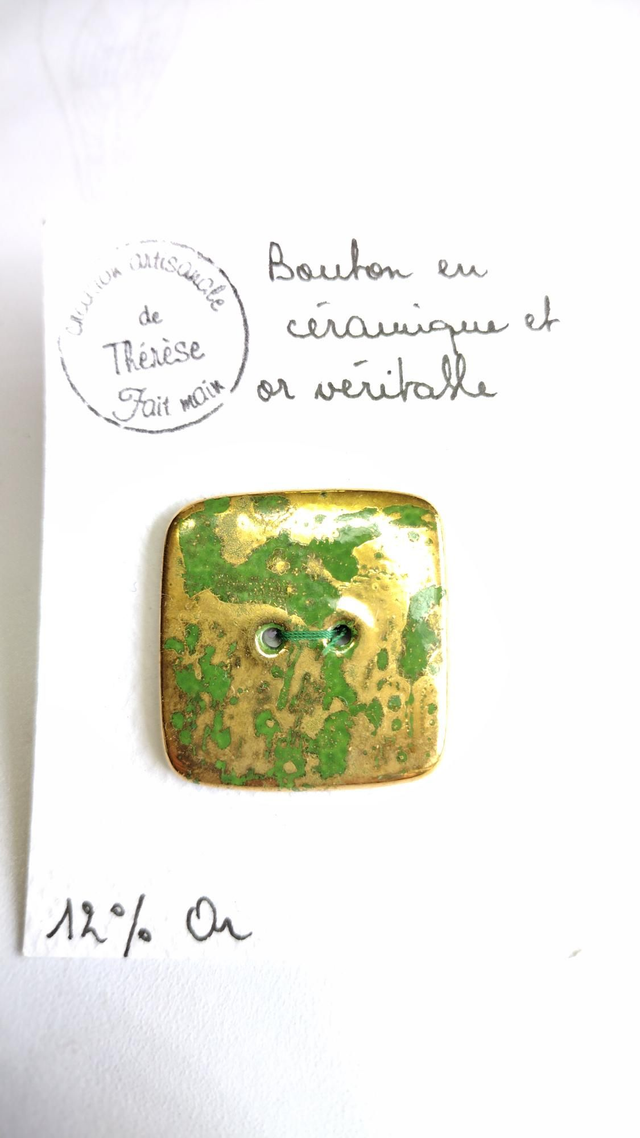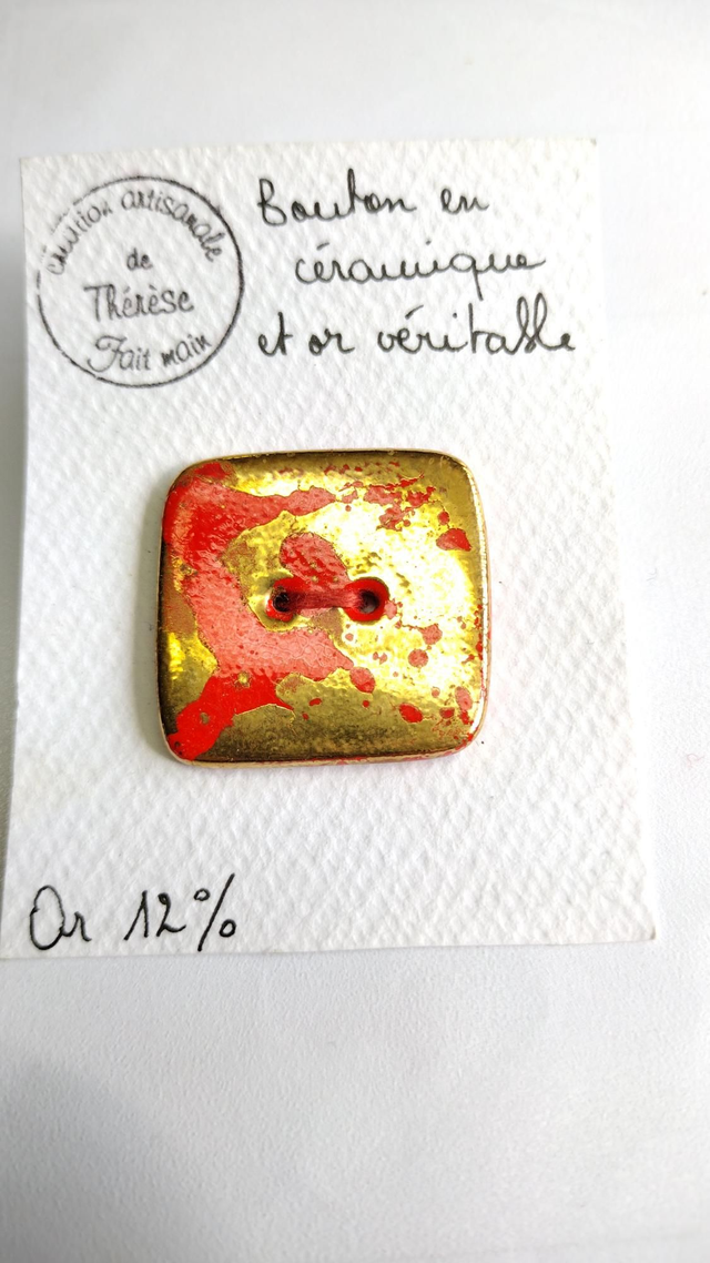 Bouton carré en faïence rouge clair, fushia ou vert + or 12 %.